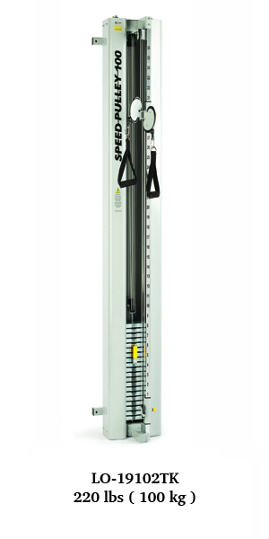 The Lojer Speed Pulley offers many more advantages than a regular pulley. You can infinitely vary the speed of the movement without having to worry about the weight plates flying up uncontrollably. Even at very high speeds, the movements and resistance are remarkably smooth. Exercise progressions can be achieved by incorporating the element of speed, thus increasing/decreasing workloads without changing the number of weight increments. It can be used with one or both handles and this will vary the resistance: 0.5kg’s per plate per rope. You can perform bilateral movements with a single pulley where you would normally need (2) regular pulleys which allow you to save space. What makes the Lojer Speed pulley so versatile is that it can be used in many functional movement patterns. For sports specific retraining, you can do such thing as a fast/slow throwing action with baseball attachment. You can perform kicking movements, racquet sport movements, cross country skiing arm action, ECT… With one rope you can travel an astonishing distance of 34 feet! This allows for forward/backward/lateral running or walking with resistance. You can also perform repeated resisted lunges over a long distance or lateral movements for hip patients. There are other interesting applications such as internal/external shoulder rotation with scapular stabilization (retraction) using the second rope. The scope of applications far exceeds a regular pulley.